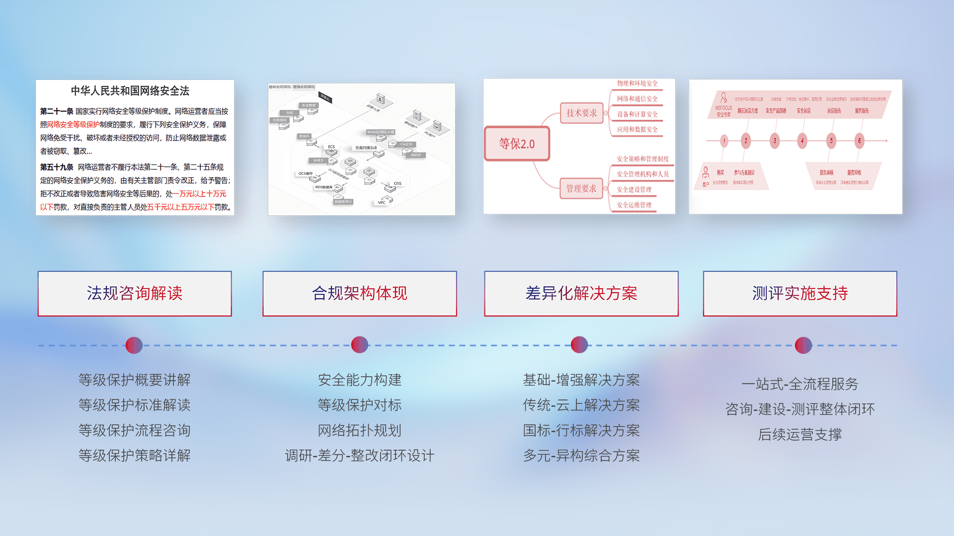 通过专业的法律咨询解读、、、合规架构体现、、差异化解决方案、、、、测试实施支持等服务,,,,为客户量身打造等保合规体系。。。